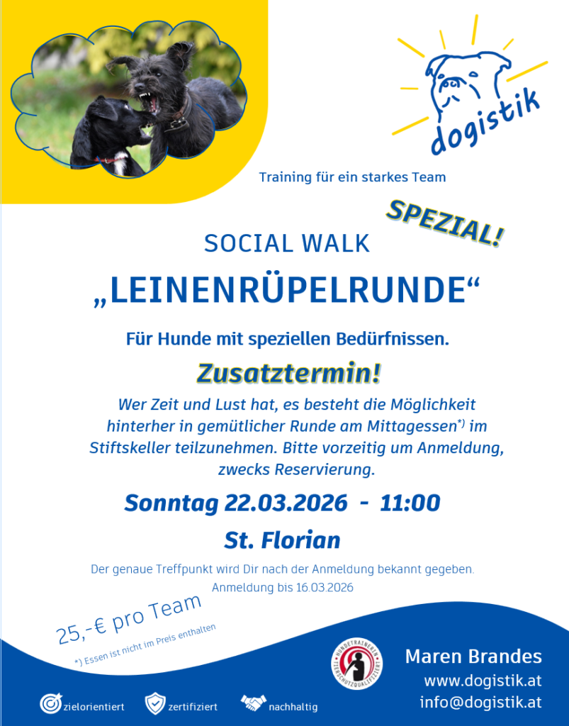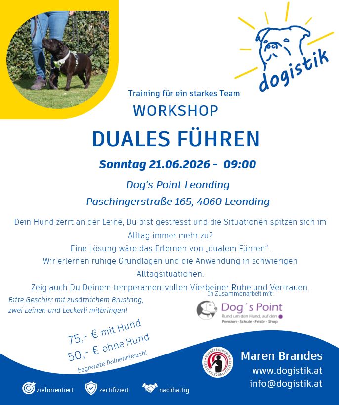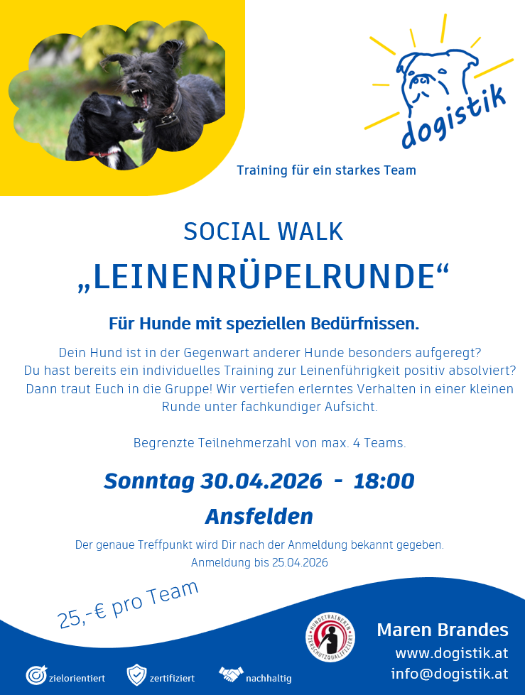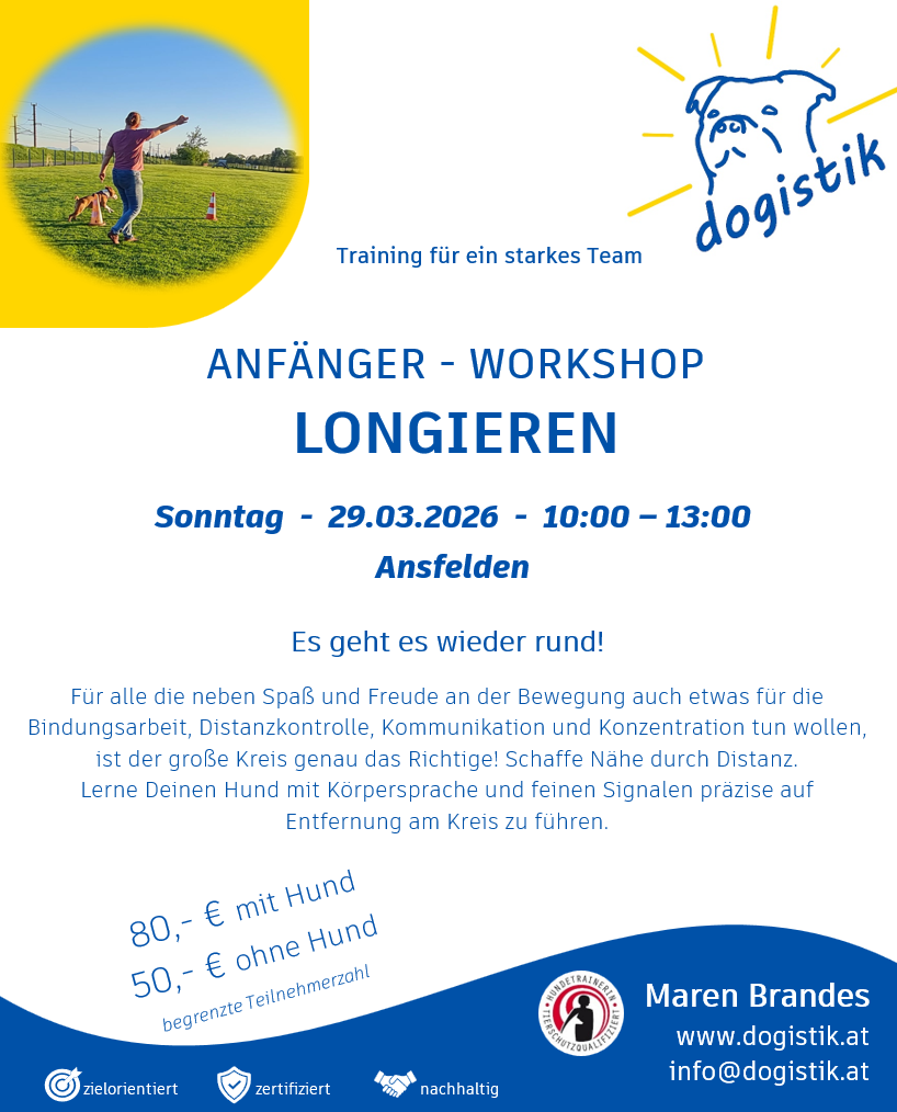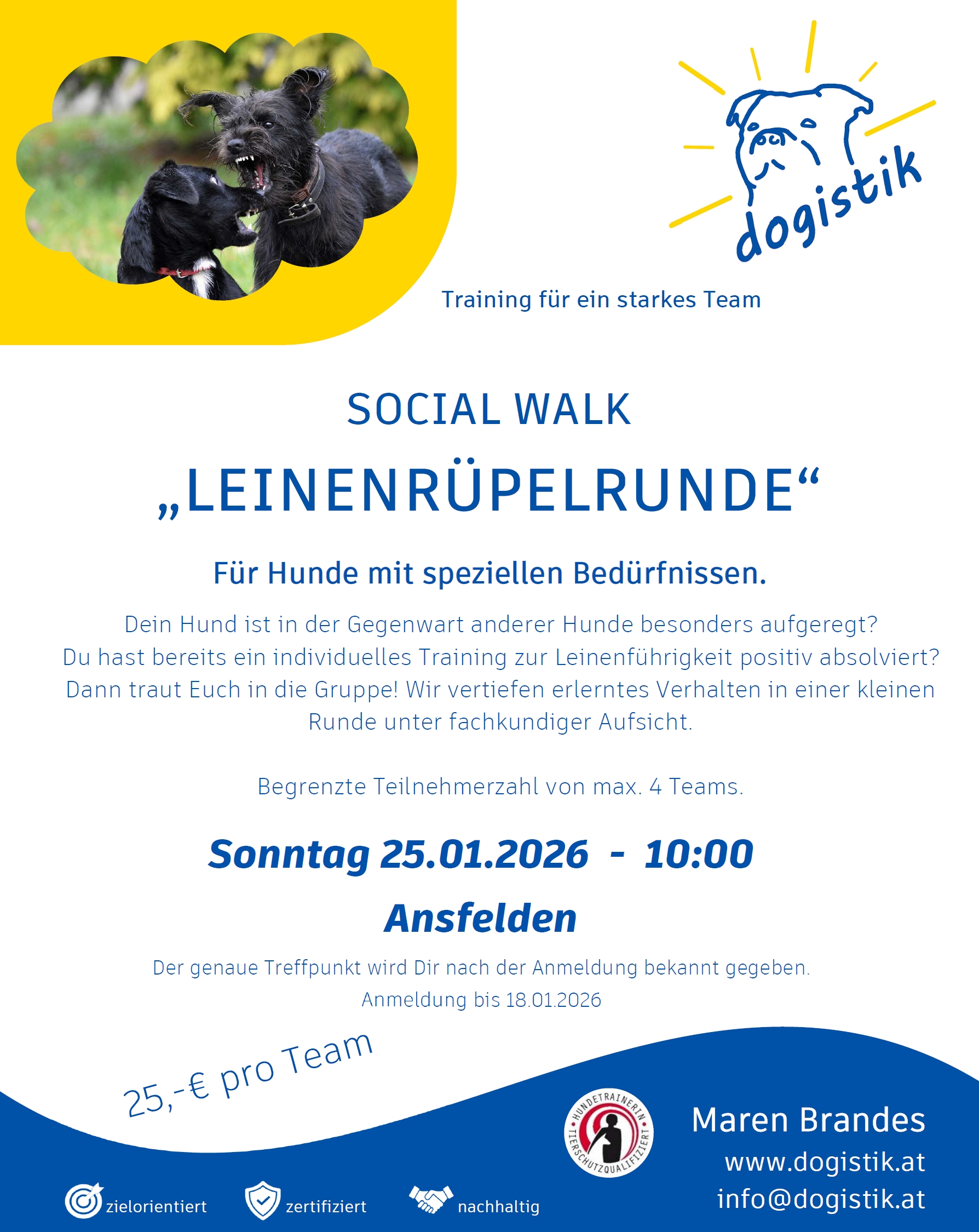 Oder Ihr seid mehrere Hundebesitzer mit ähnlichen Interessen? Dann bin ich gerne bereit, Eurer Einladung zu folgen und individuell mit Euch ein Thema zu bearbeiten.